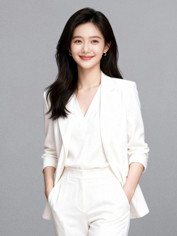 保留人物脸型、年龄特征生成职场形象照,50mm标准焦段,F/4光圈(F/2.8-F/4区间),相机与人物距离3米,横向16:9比例(左右预留环境空间),人物占画面60%,入镜头部至膝盖上方5cm,平视视角,人物居中构图,头肩比例协调,主体锐利,美颜磨皮韩式精致自然的浓妆,均匀肤色提亮肤色,身穿高级白色西装,同色系V领内搭,白色西裤,高级简约精致小耳钉,发质自然垂落有层次,淡雅清新; 双手插裤兜的站立姿态呈现, 臀部以上半身像,中心构图,头肩比例协调, 结构准确,浅浅微笑表情、肢体动作自然生动;双侧柔和自然打光,画质清晰,头部完整,高清棚拍专业摄影人像写真,中性光,修饰脸型,肤质哑光细腻,面部雾面柔光,轻透裸肌感,真实毛孔纹理,32K画质,去除人物之外的所有元素,零噪点降噪,极简中度灰度纯色背景。