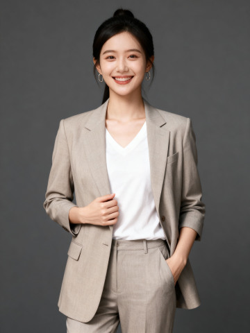 保留人物脸型、发型、年龄特征生成标准职场形象照,50mm焦段,F/4光圈(F/2.8-F/4区间),相机与人物距离3米,横向16:9比例(左右预留环境空间),人物占画面60%,入镜头部至膝盖上方5cm,平视视角,人物居中构图,头肩比例协调,身穿杏灰色西装,内搭白色v领衬衫,和同色系西裤,剪裁利落干练;搭配极简银色小耳钉,风格优雅精致,采用左手插兜、右手轻扶西装侧襟,主体锐利,双侧打柔和光,美颜磨皮精致浓妆,均匀肤色提亮肤色,发质柔顺光泽,眼神直视镜头,站立姿势,目光坚定且澄澈,表情自然.嘴角上扬,气质自信从容大气;均匀肤色,专业人像摄影写真,头部完整,结构准确;光比1:1.5,4800K中性光,修饰脸型,肤质哑光细腻,面部雾面柔光,轻透裸肌感,真实毛孔纹理,32K画质,去除人物之外的所有元素,零噪点降噪,简约偏暖调深灰纯色背景。