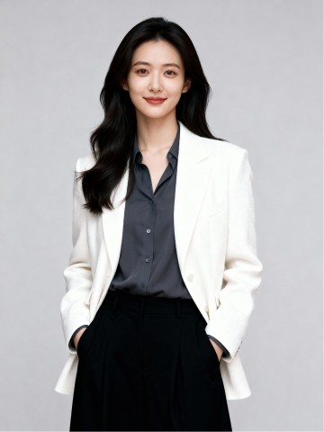 保留人物脸型、年龄特征生成标准职场形象照,50mm焦段,F/4光圈(F/2.8-F/4区间),相机与人物距离3米,横向16:9比例(左右预留环境空间),人物占画面60%,入镜头部至膝盖上方5cm,平视视角,人物居中构图,头肩比例协调,主体锐利,美颜磨皮韩式精致浓妆,均匀肤色提亮肤色,唇色自然微红,白色高级精纺面料西装,深空灰色衬衫,黑色阔腿裤,双手插兜的站立姿态,松弛不刻意,散发生活化的惬意感,中长发披肩,弧度自然,发型柔顺光泽,眼神直视镜头,目光温柔澄澈,表情自然,嘴角微微上扬,气质自信从容霸气干练;均匀肤色,专业人像摄影写真,头部完整,结构准确;光比1:1.5,4800K中性光,修饰脸型,肤质哑光细腻,轻透裸肌感,真实毛孔纹理,32K画质,去除人物之外的所有元素,零噪点降噪,简约中度灰纯色背景。