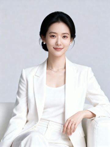 保留人物脸型、年龄特征生成标准职场形象照,50mm焦段,F/4光圈(F/2.8-F/4区间),相机与人物距离3米,横向16:9比例(左右预留环境空间),人物占画面60%,入镜头部至膝盖上方5cm,平视视角,人物居中构图,头肩比例协调,身穿白色简约精致西装,佩戴极简珍珠小耳钉,下装黑色中裙;长发自然波浪发尾微卷,温柔精致,主体锐利,双侧打柔和光,美颜磨皮韩式精致浓妆,均匀肤色提亮肤色,跷二郎腿优雅坐姿,双臂交叉自然搭于腿上,手部姿态放松且舒展,眼神直视镜头,目光坚定且澄澈,表情自然.嘴角上扬,气质自信温婉时尚柔美;均匀肤色,专业人像摄影写真,头部完整,结构准确;光比1:1.5,4800K暖调中性光,修饰脸型,肤质哑光细腻,面部雾面柔光,轻透裸肌感,真实毛孔纹理,32K画质,去除人物之外的所有元素,零噪点降噪,简约中深灰度纯色背景。