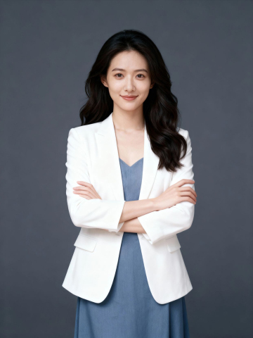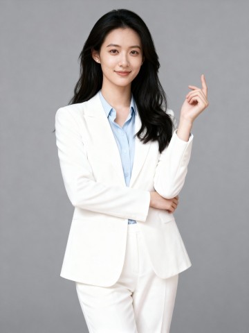 保留人物脸型、年龄特征生成标准职场形象照,50mm焦段,F/4光圈(F/2.8-F/4区间),相机与人物距离3米,横向16:9比例(左右预留环境空间),人物占画面60%,入镜头部至膝盖上方5cm,平视视角,人物居中构图,头肩比例协调,主体锐利,双侧打柔和光,美颜磨皮韩式精致浓妆,冷白皮,均匀肤色提亮肤色,身穿白色西装;浅蓝色衬衫内搭,下装白色西裤;佩戴极简银色小耳钉。左臂自然交叉于胸前,肘部微收;右臂抬起,肘部微屈,手腕轻抬至胸前右侧位置。右手呈优雅的半握式姿态,食指与中指轻拢,无名指和小指自然弯曲,指尖微微向内收拢,精致内敛有气质。站立姿势,干练霸气,披发,发梢微卷,眼神直视镜头,目光温柔澄澈,表情自然,嘴角微微上扬,气质自信从容;均匀肤色,专业人像摄影写真,头部完整,结构准确;光比1:1.5,4800K中性光,修饰脸型,肤质哑光细腻,轻透裸肌感,真实毛孔纹理,32K画质,去除人物之外的所有元素,零噪点降噪,简约中灰度纯色背景。