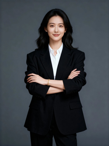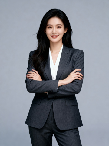 保留人物脸型、发型、年龄特征生成职场形象照,50MM标准焦段,F/4光圈(F/2.8-F/4区间),相机与人物距离3米,横向16:9比例(左右预留环境空间),人物占画面60%,入镜头部至膝盖上方5CM,平视视角,臀部以上的半身照,人物居中构图,头肩比例协调,主体锐利,美颜磨皮韩式精致自然的浓妆,均匀肤色提亮肤色,V领深灰色西装(偏暗),内搭白色V领衬衫;深灰色西裤(偏暗);发质柔顺光泽;双臂交叉于胸前,姿态舒展,传递出自信从容的气场.表情自然,干练;微笑;双侧柔和打光,画质清晰,头部完整,高清棚拍专业摄影人像写真,均匀肤色,头部完整,结构准确;光比1:1.5,4800K中性光,修饰脸型,肤质哑光细腻,面部微微雾面柔光,轻透裸肌感,真实毛孔纹理,32K画质,去除人物之外的所有元素,零噪点降噪,极简中灰度(偏冷)纯色背景。