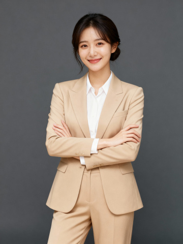保留人物脸型、年龄特征生成职场形象照,50MM标准焦段,F/4光圈(F/2.8-F/4区间),相机与人物距离3米,横向16:9比例(左右预留环境空间),人物占画面60%,入镜头部至膝盖上方5CM,平视视角,人物居中构图,头肩比例协调,主体锐利,美颜磨皮韩式精致自然的浓妆,均匀肤色提亮肤色,上装杏色高级西装,白色衬衫内搭,下装杏色高级西裤,层次分明;韩式低盘发(带碎发)发型极简精致,发质柔顺自然飘逸,双臂交叉于胸前,肢体舒展规整,传递出自信从容的气场;臀部以上半身像,中心构图,头肩比例协调,表情自然,眼神明亮,浅浅微笑,直视镜头,神态亲和且充满活力;柔和自然打光,画质清晰,头部完整,高清棚拍专业摄影人像写真,去除人物之外的所有元素,结构准确;光比1:1.5,4800K中性光,修饰脸型,肤质哑光细腻,面部雾面柔光,轻透裸肌感,真实毛孔纹理,32K画质,去除人物之外的所有元素,零噪点降噪,中深灰度(微微偏暖调)纯色背景。
