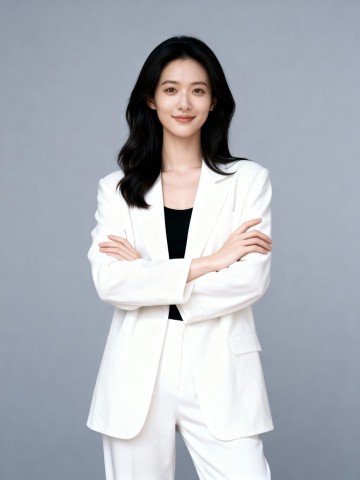 保留人物脸型、年龄特征生成标准职场形象照,美颜轻度磨皮韩式精致浓妆,均匀肤色提亮肤色,50mm焦段,F/4光圈(F/2.8-F/4区间),相机与人物距离3米,横向16:9比例(左右预留环境空间),人物占画面60%,入镜头部至膝盖上方5cm,平视视角,人物居中构图,头肩比例协调,主体锐利,双侧打光,身穿白色宽松版型西装,内搭黑色上衣,白色西裤,双臂交叉于胸前,手臂舒展,表情自然,站立姿势,温婉沉稳,中长发披肩,弧度自然,发型柔顺光泽,眼神直视镜头,目光温柔澄澈,表情自然,嘴角微微上扬,气质自信从容;均匀肤色,专业人像摄影写真,头部完整,结构准确;修饰脸型,肤质哑光细腻,轻透裸肌感,真实毛孔纹理,32K画质,去除人物之外的所有元素,零噪点降噪,简约冷调中灰度纯色背景。