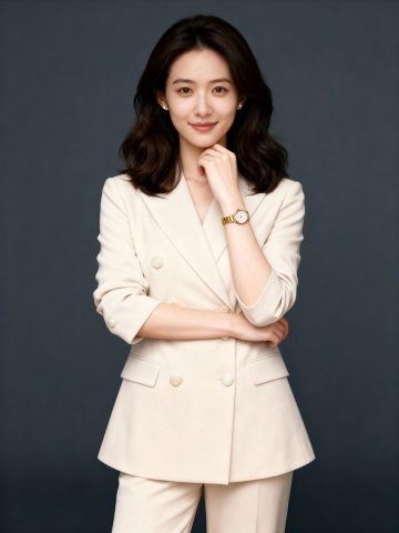 保留人物脸型、年龄特征生成标准职场形象照,50mm焦段,F/4光圈(F/2.8-F/4区间),相机与人物距离3米,横向16:9比例(左右预留环境空间),人物占画面60%,入镜头部至膝盖上方5cm,平视视角,人物居中构图,头肩比例协调,身穿浅米色双排扣西装(贝母纽扣)同色系西裤,佩戴极简高级耳钉;精致金色女士细腕表,左臂交叉于胸前、右臂抬起,右手轻抵下颌;主体锐利,双侧打柔和光,美颜磨皮精致浓妆,均匀肤色提亮肤色,深棕中长发披肩发质柔顺飘逸.自然微卷发,眼神直视镜头,站立姿势,目光坚定且澄澈,表情自然.嘴角上扬,气质自信温和稳重;均匀肤色,专业人像摄影写真,头部完整,结构准确;光比1:1.5,4800K冷调中性光,修饰脸型,肤质哑光细腻,面部雾面柔光,轻透裸肌感,真实毛孔纹理,32K画质,去除人物之外的所有元素,零噪点降噪,简约暖调深灰纯色背景。