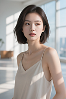 保留人物脸型、年龄特征生成职场形象照,50MM标准焦段,F/4光圈(F/2.8-F/4区间),相机与人物距离3米,横向16:9比例(左右预留环境空间),人物占画面70%,入镜头部至膝盖上方5CM,主体锐利,美颜磨皮韩式精致自然的浓妆,白色V领韩式版型长袖衬衫,黑色西裤,职场通勤风格;黑发束起低盘发(带碎发)发型精致有型,佩戴简约小耳环;单手轻托下巴,另一手自然交叉于臂弯,站立姿势,浅笑,人物居中,头肩比例协调,平视视角,人物居中构图,头肩比例协调,姿态优雅,均匀肤色提亮肤色,从容自信,柔和自然打光,画质清晰,高清棚拍专业摄影人像写真,头部完整,结构准确;光比1:1.5,4800K中性光,修饰脸型,肤质哑光细腻,面部雾面柔光,轻透裸肌感,真实毛孔纹理,32K画质,去除人物之外的所有元素,零噪点降噪,极简中灰度纯色背景。
