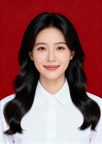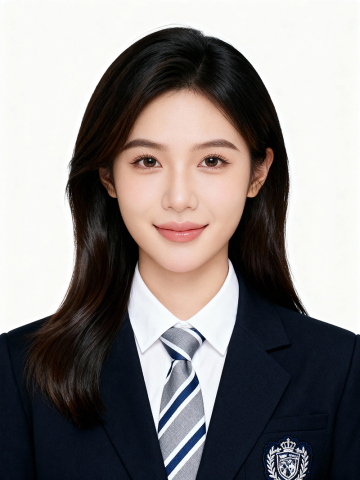 生成标准样式的证件照: 参考第一张图保留人物脸型、发型、年龄特征; 参考第二张图的人物占位和比例; 肤色肤质:提亮肤色,消除暗沉,轻度磨皮,轻度美颜,清透裸妆,隐形毛孔,均匀肤色,眉形整洁,唇色自然提亮; 构图布局:纯正面,胸部以上半身像;头部居中,头顶距上边缘约10%,下巴距下边缘约30%,左右耳对称露显,肩部平展,上半身占画面下方约40%,人物占比约画面的60%-70%; 光线画质:均匀柔光,面部明亮无硬影,背景均匀提亮,画质清晰,零噪点降噪; 照片要求:免冠,脸部无遮挡露出五官,表情自然,露额露耳,面部清晰且无畸变; 其他要求:去除首饰,去除头饰,去除人物之外的所有元素,头部完整;高盘发小丸子头发型,身穿黑色紧身圆领长袖上衣,简约纯白色背景