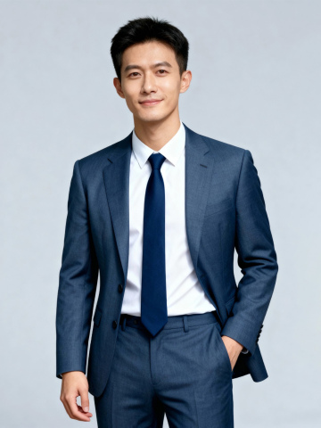 保留人物脸型、发型、年龄特征生成标准职场形象照,50mm焦段,F/4光圈(F/2.8-F/4区间),相机与人物距离3米,横向16:9比例(左右预留环境空间),人物占画面60%,入镜头部至膝盖上方5cm,平视视角,人物居中构图,头肩比例协调,身穿蓝灰色西装,内搭白色衬衫,同色系西裤,深蓝色领带,正式严谨专业稳重,身形匀称,姿态端正。呈正面单手插兜的站立姿态,肢体舒展自然,自信从容;主体锐利,双侧打柔和光,痘印精准去除.肤质精细化处理;消除暗沉轻度磨皮,轻度美颜,均匀肤色提亮肤色,发梢微微修整干练大气,眼神直视镜头,目光坚定且澄澈,表情自然.嘴角上扬,均匀肤色,专业人像摄影写真,头部完整,结构准确;光比1:1.5,4800K中性光,修饰脸型,肤质哑光细腻,面部雾面柔光,轻透裸肌感,真实毛孔纹理,32K画质,去除人物之外的所有元素,零噪点降噪,简约偏冷调中灰度纯色背景(雾面漫射弱反光)。