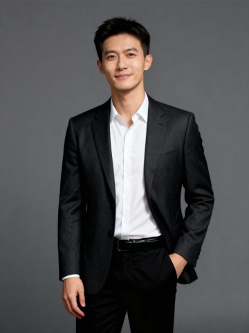 保留人物脸型、发型、年龄特征生成标准职场形象照,50MM焦段,F/4光圈(F/2.8-F/4区间),相机与人物距离3米,横向16:9比例(左右预留环境空间),人物占画面60%,入镜头部至膝盖上方5CM,平视视角,人物居中构图,头肩比例协调,身穿深黑灰色单粒扣西装,内搭白色衬衫,下装黑色西裤搭配黑色皮带,身形匀称,姿态端正;着装正式,风格简洁。单手插兜的站立姿态,肢体舒展自然,自信从容;主体锐利,双侧打柔和光,痘印精准去除,肤质精细化处理;消除暗沉轻度磨皮,轻度美颜,均匀肤色提亮肤色,发梢微微修整,眼神直视镜头,目光坚定且澄澈,表情自然.嘴角上扬,亲和感内敛稳重;均匀肤色,专业人像摄影写真,头部完整,结构准确;光比1:1.5,4800K暖调中性光,修饰脸型,肤质哑光细腻,面部雾面柔光,轻透裸肌感,真实毛孔纹理,32K画质,去除人物之外的所有元素,零噪点降噪,简约中深灰色纯色背景(雾面漫射弱反光)。