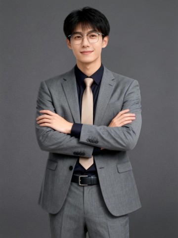 保留人物脸型、发型、年龄特征生成职场形象照,正脸照;人物居中,身材匀称,消除痘印,肤质优化处理提亮肤色,均匀肤色,干净的男士淡妆,气色自然,无明显浓妆痕迹;身穿灰色西装,深色衬衣,下装灰色西裤,深黑灰色真皮皮带,高级浅咖色领带,发梢规整,双臂交叉于胸前的站立姿态,肢体舒展自然,自信沉稳的气场,臀部以上半身像,表情动作自然,眼神坚定直视镜头,嘴角上扬,表情沉稳淡然;专业人像摄影,淡妆,柔和自然打光,画质清晰,头部完整,高清棚拍专业摄影人像写真,去除人物之外的所有元素,50MM标准焦段,F/4光圈(F/2.8-F/4区间),相机与人物距离2米,横向16:9比例(左右预留环境空间),人物占画面60%,入镜头部至膝盖上方5CM,平视视角,头肩比例协调,结构准确;光比1:1.5,4800K中性光,修饰脸型,肤质哑光细腻,面部雾面柔光,轻透裸肌感,真实毛孔纹理,32K画质,去除人物之外的所有元素,零噪点降噪,极简深灰度纯色背景。