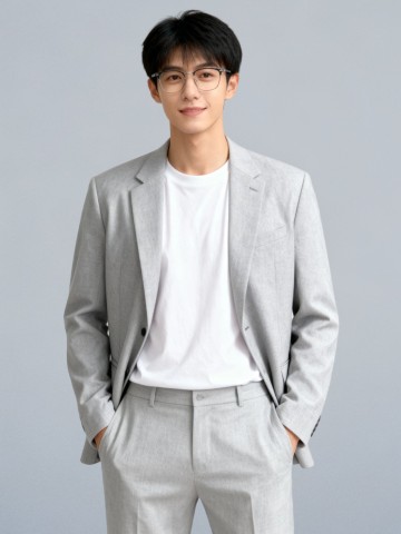 保留人物脸型、发型、年龄特征生成职场形象照,正脸照;人物居中,消除痘印,肤质优化处理提亮肤色,均匀肤色,干净的男士淡妆,气色自然,无明显浓妆痕迹;身穿浅灰色西装,白色T恤,下身浅灰色西裤,休闲双手插兜的姿态,肢体自然松弛,站立姿势,从容干练,臀部以上半身像,人物居中,表情动作自然,嘴角上扬,内敛,眼神坚定直视镜头,表情沉稳淡然;淡妆,柔和自然打光,画质清晰,头部完整,高清棚拍专业摄影人像写真,去除人物之外的所有元素,50MM标准焦段,F/4光圈(F/2.8-F/4区间),相机与人物距离3米,横向16:9比例(左右预留环境空间),人物占画面60%,入镜头部至膝盖上方5CM,平视视角,人物居中构图,头肩比例协调,结构准确;光比1:1.5,4800K中性光,修饰脸型,肤质哑光细腻,面部雾面柔光,轻透裸肌感,真实毛孔纹理,32K画质,去除人物之外的所有元素,零噪点降噪,极简中灰度纯色背景。