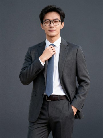 保留人物脸型、发型、年龄特征生成职场形象照,正脸照;人物居中,消除痘印,肤质优化处理提亮肤色,均匀肤色,干净的男士淡妆,气色自然,无明显浓妆痕迹;身穿暗灰色西装西裤,白色衬衣,灰蓝色领带,暗色皮带,西装剪裁合身,面料挺括,一手轻调整领带,另一手插于裤兜,站立,臀部以上半身像,表情动作自然,眼神坚定直视镜头,表情沉稳淡然;淡妆,柔和自然打光,画质清晰,头部完整,高清棚拍专业摄影人像写真,去除人物之外的所有元素,50MM标准焦段,F/4光圈(F/2.8-F/4区间),相机与人物距离2米,横向16:9比例(左右预留环境空间),人物占画面60%,入镜头部至膝盖上方20CM,平视视角,头肩比例协调,结构准确;光比1:1.5,4800K中性光,修饰脸型,肤质哑光细腻,面部雾面柔光,轻透裸肌感,真实毛孔纹理,32K画质,去除人物之外的所有元素,零噪点降噪,中深灰度纯色背景。