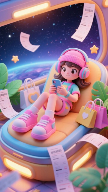 一个潮流女孩,戴着粉色帽子和耳机,穿着粉色鞋子,躺在太空舱上玩手机,长长的发票,点缀绿植叶片、购物袋、星星,星空背景