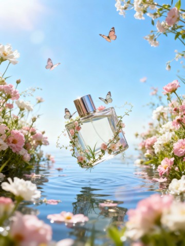 主体倾斜10度悬浮在水上(主体占画面比为30%),自然元素(花朵、藤蔓、小草)装饰主体,2只小蝴蝶环绕。画面结合光晕营造出梦幻、轻盈的氛围感,背景为渐变蓝天,大量粉白花丛、花朵漂浮在水面和空中,整个画面清透明亮,保证溶图效果。