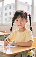 3D卡通风格,环境明亮,一个黄色的小狐狸玩偶,坐在教室里,玩偶低头认真看书,顶部手写可爱大文字”一研为定!“