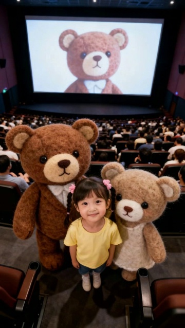 背景为电影院坐满观众,人物面对镜头,银幕显示泰迪熊海报。