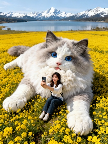 全景广角镜头,鱼眼效果(无暗角),保持第一张图人物特征一致与第二张图宠物的温馨合影(近景):张力感,将第二张图的宠物整体体型变大为人的好几倍(巨物感),宠物松弛的趴在青绿色的草地上(眼神澄澈灵动,温顺且安静),人物侧身坐在宠物身旁,依偎在宠物身边,背靠在宠物的绒毛上,表情可爱灵动,姿态放松休闲松弛感(看向镜头表情自然,嘴角上扬,互动感强,亲切感),背景是夏日湖边(湖光掠影)浓密的树荫下,极强的广角镜头,仰视视角,日系胶片摄影,模拟莱卡相机拍摄,胶片摄影,电影写真质感,梦核,高对比度,质感十足,电影级色调,真实光影,梦核发光感,胶片朦胧感,充满张力的镜头语言,清新治愈系午后,大师级构图,温馨感,电影海报构图