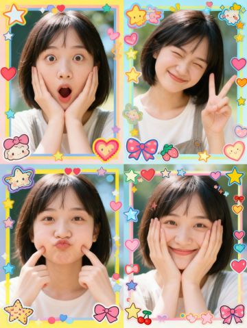 生成一组4张大头贴照片,每张照片都要有不同的表情和动作,动作要夸张,每张图的周边都是大头贴的边框和贴纸装饰