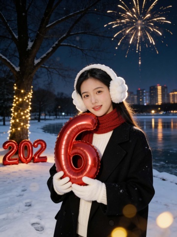 整体色调温暖饱和,童话感奇幻感梦幻感与圣诞氛围融合,呈现浪漫柔美的视觉效果,胶片质感,女生身着红色露肩毛衣,佩戴装饰草莓+铃铛的红色贝雷帽,搭配针织手套、红金圣诞风耳饰与颈链,人物姿态自然优雅,微笑,极浅淡红色的腮红画到鼻头(晕染开,没有明细那边界),与温馨的节日氛围相得益彰,发丝光,背景是圣诞装饰的冬日街道,装饰有金色球的圣诞树、红色雪人摆件及圣诞袜,背景虚化,光晕,环境暗调衬托,突出人物主体(边缘带微微辉光光效),周围飘落雪花。
