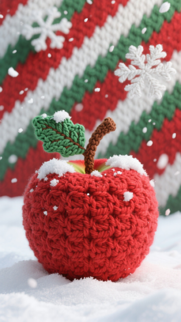 雪地场景中的圣诞平安果,带绿叶与棕色果柄,有少量落雪点缀。背景是红白绿斜条纹装饰,空中飘落白色雪花。