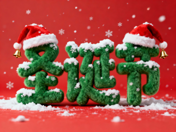 毛绒质感绿色艺术字 “圣诞节”,表面覆盖白色积雪效果,带红色圣诞帽、铃铛装饰。纯红色背景。