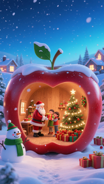 覆雪带绿叶的巨型红苹果立体场景:内部木质空间里,圣诞老人正给两个孩子递礼物,圣诞树绕暖灯、旁堆礼盒;外部左侧雪人带绿围巾,右侧散落礼盒。背景蓝色渐变夜空飘雪,远处亮灯房屋错落。