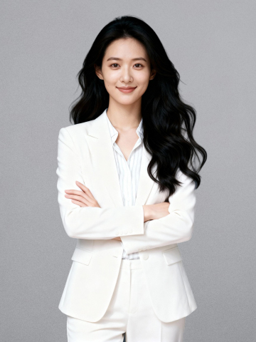 保留人物脸型、年龄特征生成职场形象照,50MM标准焦段,F/4光圈(F/2.8-F/4区间),相机与人物距离3米,横向16:9比例(左右预留环境空间),人物占画面60%,入镜头部至膝盖上方5CM,平视视角,人物居中构图,头肩比例协调,主体锐利,美颜磨皮韩式精致自然的浓妆,均匀肤色提亮肤色,白色高级西装,内搭白色浅灰细条纹衬衫,下装白色西裤,层次分明;波浪长发,发质柔顺自然飘逸,双臂交叉于胸前,肢体舒展规整,传递出自信从容的气场;表情自然,眼神明亮带笑,直视镜头,神态亲和且充满活力;柔和打光,画质清晰,高清棚拍专业摄影人像写真,头部完整,结构准确;光比1:1.5,4800K中性光,修饰脸型,肤质哑光细腻,面部雾面柔光,轻透裸肌感,真实毛孔纹理,32K画质,去除人物之外的所有元素,零噪点降噪,极简中深灰度纯色背景。