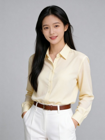 场景为巴黎都市十字路口,欧式建筑林立,街道上有车辆穿行。人物斜靠在路灯旁姿态舒展,身着法式简约时尚套装。在人的周围放很多萨摩耶狗狗。时尚大片感。