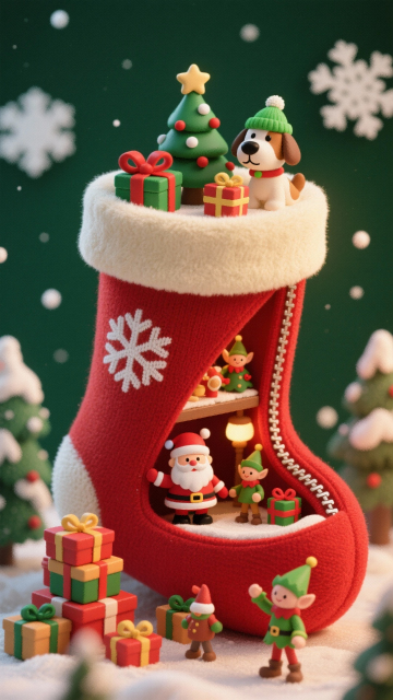 主体是鲜红色巨型圣诞袜(袜身印白色雪花纹,顶部配米白色绒边,侧边设拉链开口),袜内分层呈现热闹的圣诞场景:上层有迷你圣诞树、礼物盒、戴绿帽的小狗玩偶;下层有圣诞老人玩偶、堆叠的礼盒、持礼物的另一位精灵玩偶。深绿背景,点缀白色雪花装饰。色彩鲜艳,暖光光线。整个场景具有动态感。