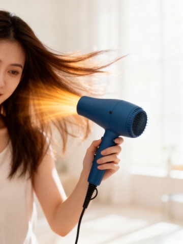 吹风机被一个女生手持着吹头发,出风口喷出线条感橘红色送风,背景在明亮的室内。