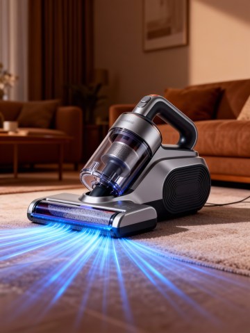 主体放在棕色调室内客厅,在地上吸尘,底部有蓝色光线,吸风效果。