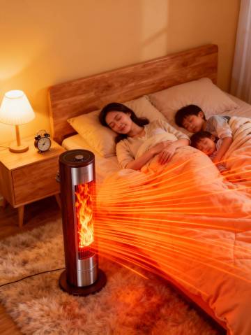 生成两宫格艺术感写真图,场景为冬日客厅,冷灰与暖橙渐变。画面主体为暖风机。上一张为近景,暖风机静置于铺羊毛毯的桌子上,添加中英字幕 字幕 “冬寒侵骨,暖意何在? Where is warmth in cold?”;下一张是客厅全景,开机出热风(暖光萦绕),添加中英字幕“一键制热,全屋皆暖。 One tap, full house warmth.”;整体色调温柔治愈,两张图合成纵向两宫格,字幕于每格底部居中。