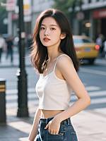 背景是街边复古咖啡店,秋天落叶,光影柔和