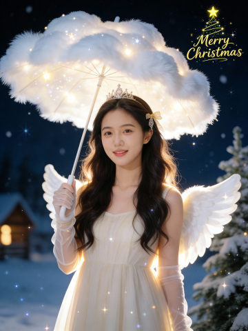 欧洲中世纪风格的雪中小镇,房屋覆盖厚雪,木质阁楼透出暖黄色灯火,街道上是热闹的圣诞市集,行人逛游,画面中心有一棵装饰华丽的巨型圣诞树,远处有教堂塔楼、雪山、夜空,雪花飘落,圣诞小镇全景,氛围静谧与浪漫。