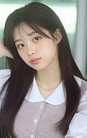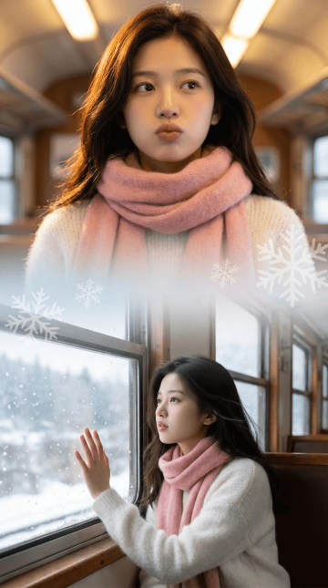 女生穿白色马海毛毛衣,粉色围巾绕颈,老式火车背景。上宫格:大特写镜头,女生脸部特写,车厢暖光从头顶灯处洒下,发丝发光,眼神带点旅途的憧憬,嘴唇微抿。下宫格:中景镜头,女生坐在老式火车窗边,手贴在车窗上看外面雪落,发丝被风(车窗缝)吹起。中间有大片雪花图标元素衔接。