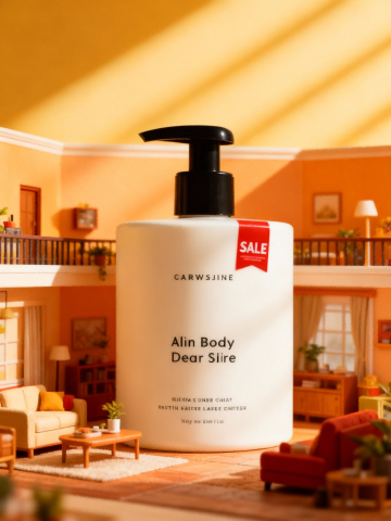 主体巨大化,被放置在一个迷你客厅中,高饱和温馨色调客厅装修,主体上挂着“SALE"标签,促销感氛围。