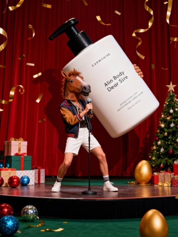 围绕模特构图,带棕色马头面具的模特(时尚年轻的穿搭)手持超级巨大化的产品摆出活泼的姿势握着前面的立麦在一个舞台上,舞台上搭配礼盒、彩球、圣诞树和金蛋,周围飘着金色彩带制造氛围;综艺宣传风格,背后的红幕布+墨绿色地面