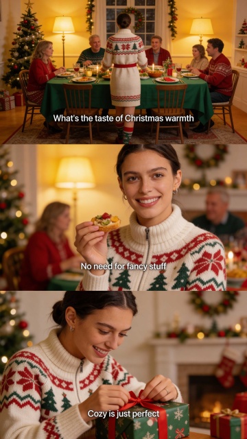 三宫格艺术感写真图,横向三宫格,场景为家常圣诞室内聚会,暖黄台灯照着铺着绿色桌布的餐桌,桌上摆着圣诞装饰,背景是家人围坐身影。画面中人物穿着圣诞风服饰。最上面一张为中景,人物背身站在餐桌旁,布置晚饭,添加字幕 “ What's the taste of Christmas warmth”;中间一张是近景,人物拿着一个晚饭小吃直视镜头,表情开心,背景是圣诞节装饰的室内,隐约人影,添加字幕 “No need for fancy stuff”;下面一张是特写,人物低头拆圣诞礼物,眉眼弯着笑,添加中英字幕 “Cozy is just perfect”。整体色调暖黄与米白交织,字幕在每格下方居中,三张图合成一个横向三宫格。