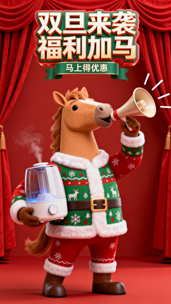 卡通风格,浅棕色拟人马,圣诞色圣诞衣,举喇叭吹奏(小线条表示发声),另一手抱着一个加湿器,画面顶部巨大的3D创意变形艺术字 “双旦来袭 福利加马”(下行小字:马上得优惠),背后的红幕布