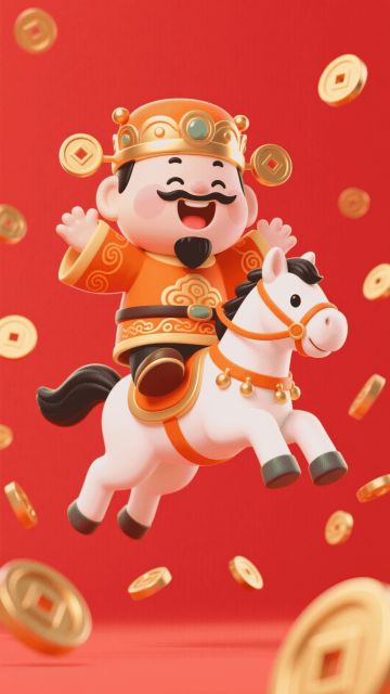 空中,整体都腾空,主体在画面偏上,干净纯红色背景,卡通 Q 版财神形象(身着橙色带金色祥云纹饰的传统服饰,头戴铜钱装饰的金色冠帽,黑胡须、粉腮红,开怀大笑、双手张开的姿态),骑乘在白色卡通小马(有黑色鬃毛,搭配橙色缰绳与鞍具,呈跃起的动态姿态)之上,周围空中散着很多动感金色铜钱。