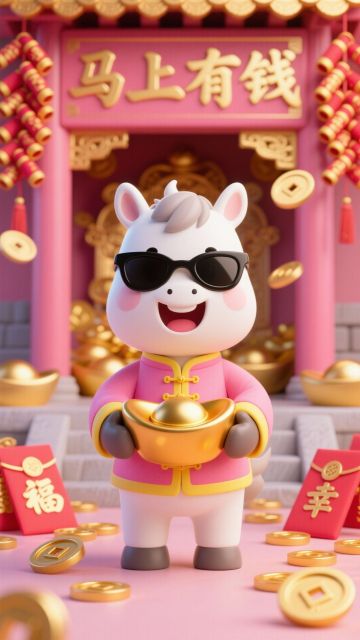 Q版白色小马身着粉色带黄色镶边的中式唐装,佩戴黑色墨镜,咧嘴大笑,双手抱着一个大号金色元宝,周围散落金色铜钱、写有 “福”“幸” 字的红包,背景是财神庙,画面上方有金色书法字体“马上有钱”,两侧悬挂鞭炮,整体粉金色调。