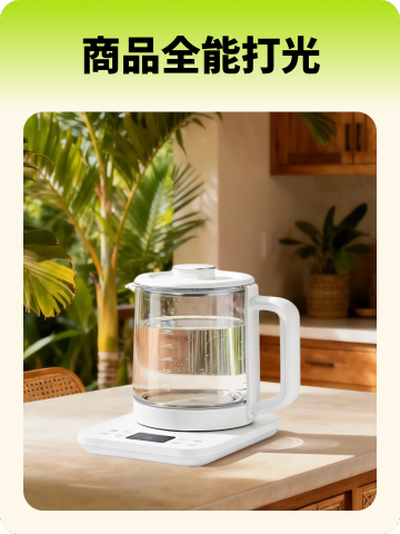 以俯视角度拍摄平铺的主体,主体居中(占画面比为25%),主体下方点缀两簇新鲜小绿叶;柔和的低饱和黄绿色背景,保证溶图效果