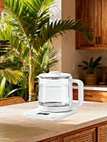 画面中心是主体置于木质台面上,布艺装饰,周围摆放着装有橙子、柠檬等水果的玻璃碗,还有玻璃杯装的饮品,背景有绿植和抽象装饰画,暖木色为主色调,光影柔和
