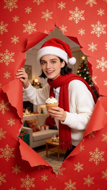 参考图中的人物戴圣诞帽和红色围巾,穿白色毛衣,撕开铺面全屏的布满金色雪花图案的红色纸张,特写人物从纸张的裂缝中侧身探出,动作自然,裂缝后是热闹的圣诞节客厅场景,人物表情开心,一只手扒在裂缝边缘,另一只手拿着纸杯蛋糕。