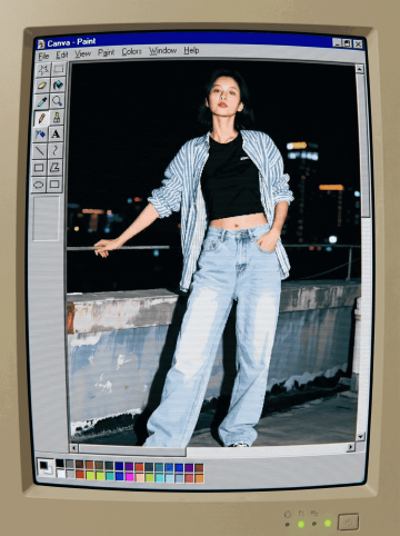 将照片处理为经典 90 年代绘图软件界面中的画布样式,呈现在复古 CRT 显示器上。