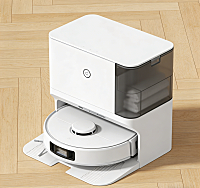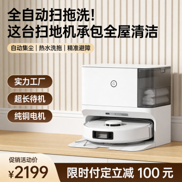 文字信息:主标题(画面左上部:“全自动扫拖洗!这台扫地机承包全屋清洁”);卖点标签(主标题下方:“自动集尘 | 热水洗拖 | 精准避障”);优势模块(左中部3个边框色块内:“实力工厂" "超长待机" "纯铜电机”);活动模块(画面下部:"促销活动价 ¥2199”“限时付定立减 100 元" )