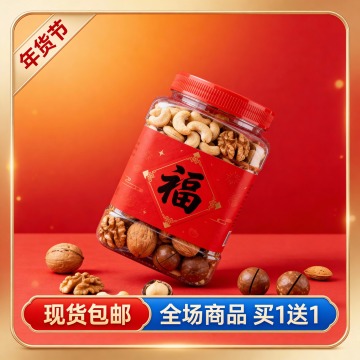 电商主图海报,海报四周装饰金色边框(顶边设计),左上三角标签写着“年货节”,底部装饰长条双色标签栏(顶边设计,左侧红金色块“现货包邮”,右侧蓝色色块“全场商品 买1送1”),主体悬浮在画面中心(占比30%,倾斜10度),整体色调红橙金,具有渐变效果和轻微的光泽感。