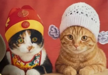 两个小猫,穿连帽卫衣,手拿玩具枪,带着墨镜,背景是港风街道