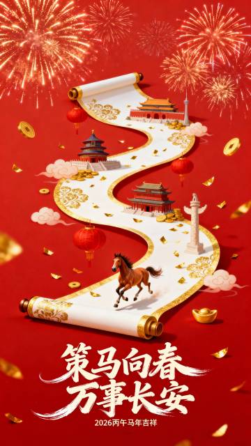 国潮插画风格,一条金色卷轴白色卷面(带金色花纹、飘落金箔)S形纵向延伸;卷轴路径上包含不一样的中国标志性新年地标,搭配红色灯笼、祥云、金币、元宝等,有一匹马在卷轴中央向下方驰骋。红色背景,有绽放的烟花,底部添加“策马向春 万事长安” 两行书法字体标题,笔画流畅飘逸拉长变形出流畅的飞白,国潮风笔触,极具视觉冲击力。底部小字“2026丙午马年吉祥”。