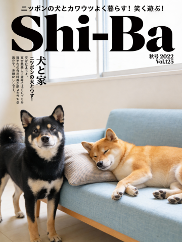 核心是图示的两只宠物(一只站立于沙发靠垫旁、一只慵懒趴卧在浅蓝布艺沙发上),背景是浅米色墙面和大窗户透入自然光。画面上方是黑色粗体标题 “Shi-Ba”,旁标 “秋号 2025 Vol.125”,顶部加 “ニッポンの犬とカワウソよく暮らす!笑く遊ぶ!” 主题文字,左侧竖排“犬と家”和日文专栏说明。